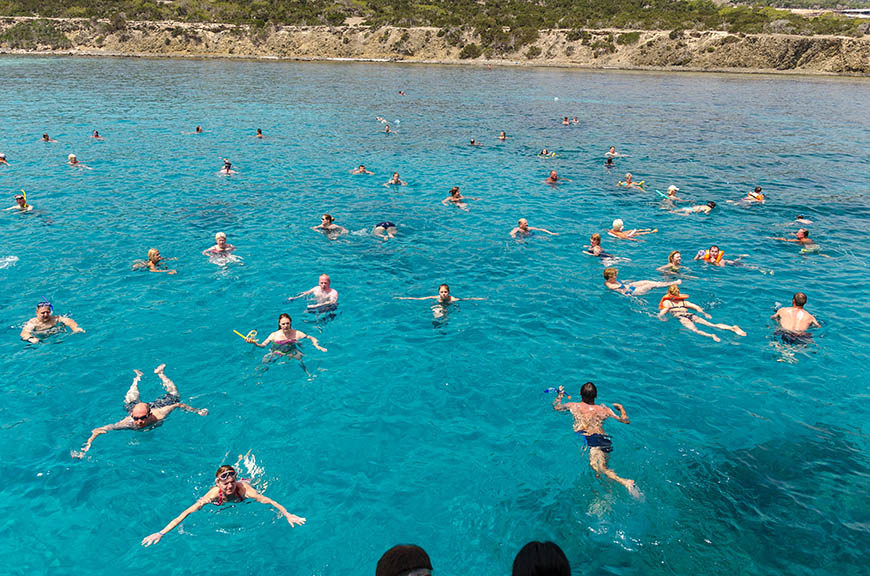 Następnie popłyniemy wzdłuż wybrzeża, mijając Fig Tree Bay, aż dotrzemy do malowniczego Cape Greco i słynnej Niebieskiej Laguny.